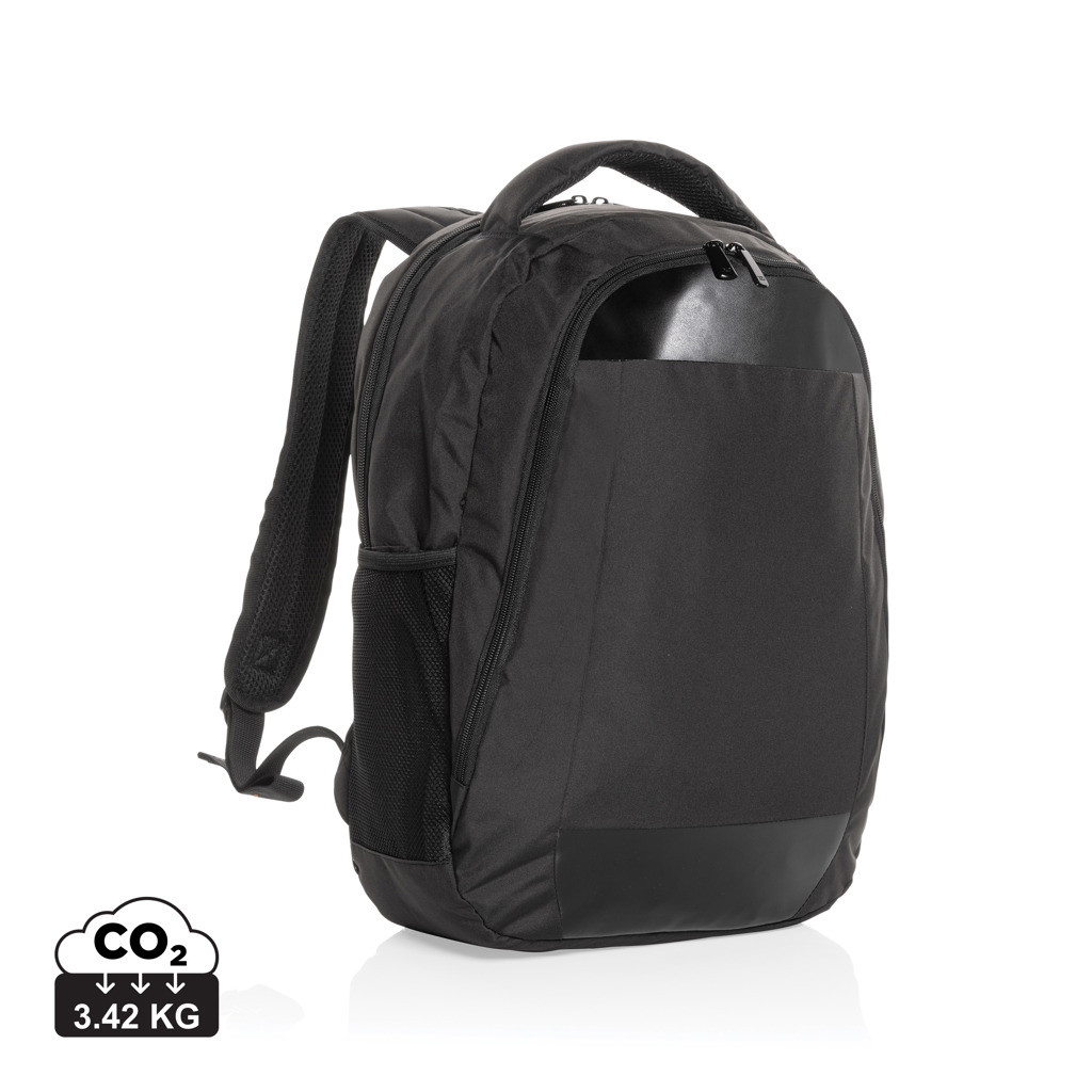 Look sharp in and out of the office with this classic looking laptop backpack. The backpack features a separate 15.6 inch laptop compartment and a zipper front pocket. The exterior material and lining is made with recycled polyester. With AWARE™ tracer that validates the genuine use of recycled materials. Each bag has reused 22 0.5L PET bottles. 2% of proceeds of each Impact product sold will be donated to Water.org. PVC free.