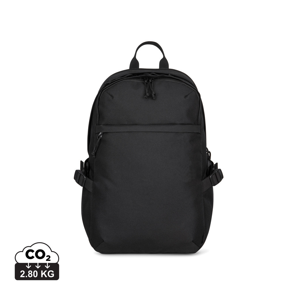 A modern and sustainable update to a classic computer backpack using recycled fabric and webbing made from plastic bottles. Top dual zippered pocket for storing accessories. Front zippered pocket with key fob clip. Dual side water bottle pockets with compression straps. Rear padded, dual zippered laptop compartment (holds up to a 15" laptop). Zippered main compartment includes interior pockets for organisation. Top grab handle. Padded back panel. Padded, adjustable shoulder straps. Includes AWARE™ Virtual ID & Product passport, which delivers an indisputable way to track and validate textile composition impact from origin to consumer. To access, scan the QR code located inside the product or visit wearaware.co to learn more. Available across both sides of the Atlantic. This item is also offered by Gemline for customers in the US and Canada.