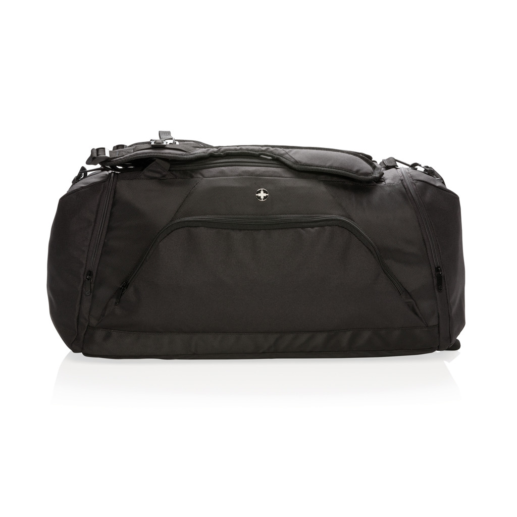 Lightweight 1680D and 600D polyester 2-in-1 bag. Works as both a backpack & duffle. Includes a roomy main compartment with a U-shaped top zipper closure, a side entry shoe or dirty clothes compartment and a side zippered pocket. The back with a bottle holder pocket and quick access pocket. Front zippered pocket with 2 RFID protected sleeves. Adjustable shoulder straps for carrying comfort and versatility. PVC Free. NFC (13.56 MHz) Blocking.