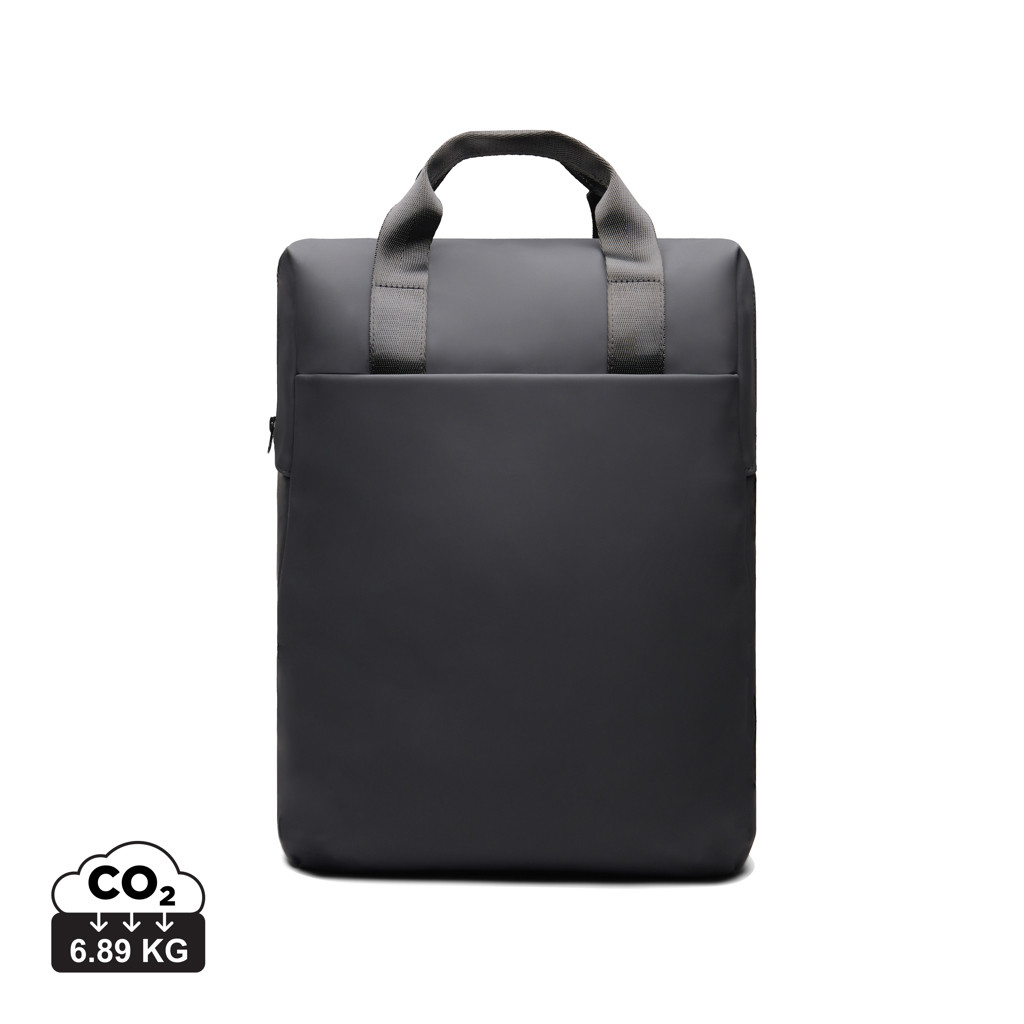 An easy-to-handle bag with a sleek design. Carry it as a tote bag or a backpack. The bag features a wide zippered opening for convenient packing of your laptop and other valuables. A strap on the back allows it to be attached to a trolley for smooth travel. It also includes a large front pocket, an inner pocket, and a practical bottle holder. Certified by RCS (Recycled Claim Standard), RCS certification guarantees that the entire supply chain of recycled materials is certified. The total recycled content is based on the overall product weight. This product contains 19% RCS certified recycled polyester.