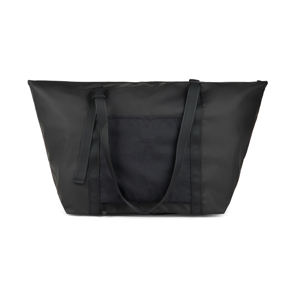 A perfect travel companion, this weekend bag is crafted from super lightweight GRS certified polyester with a sleek PU coating. Simply fold it and secure with the clever strap and buckle for storing compactly when not in use. Featuring a clever outer pocket that transforms into a secure trolley sleeve that allows you to slip it over a wheeled suitcase or trolley. Featuring adjustable straps to carry by hand or over your shoulder. Smaller inner pocket for your essentials. These versatile bags are not only easy to carry but are also designed to fold and store compactly in your luggage, providing convenient extra storage without weighing you down. Certified by GRS (Global Recycled Standard), this certification guarantees that the entire supply chain of the recycled materials is certified. The total recycled content is based on the overall product weight. This product contains 52% GRS certified recycled polyester.