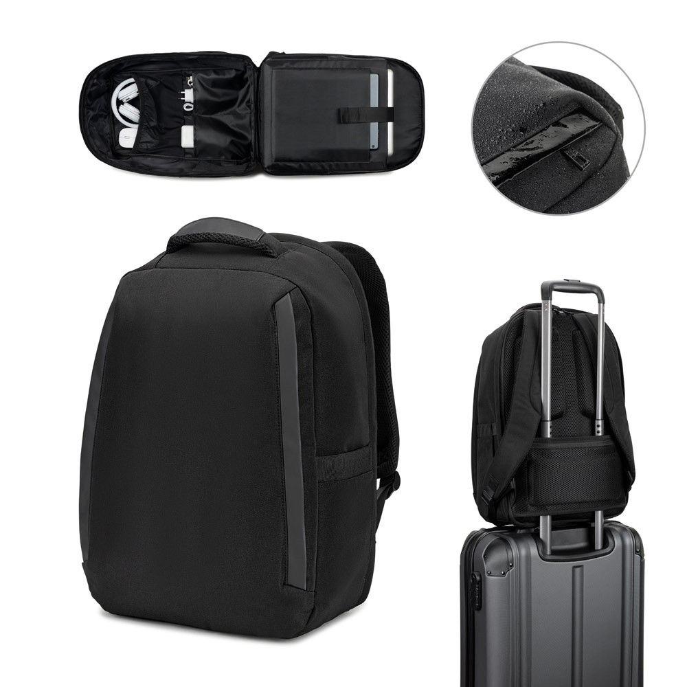 Anti-theft backpack with a unique design designed to ensure greater security for your devices and documents. Made of 600D recycled twill polyester, water-resistant, with PU details and a 210D recycled polyester lining. It has a main compartment with a padded pocket for a laptop up to 17'3" and a tablet up to 10'5", side pockets and a front pocket. The backpack offers you greater comfort when travelling due to its padded top handle and back with extra padding and trolley strap with pocket for small items. The internal pockets make it easy to store and organise your gear. Capacity up to 20 L. 310 x 450 x 200 mm
